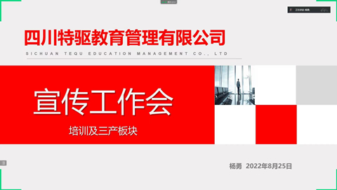 為進(jìn)一步加強(qiáng)培訓(xùn)及三產(chǎn)版塊宣傳工作,提高各單位宣傳人員積極性、責(zé)任心,8月25日,特驅(qū)教育宣傳部組織召開了培訓(xùn)及三產(chǎn)版塊宣傳工作會(huì)議,特驅(qū)教育副總裁文道山、各單位宣傳分管領(lǐng)導(dǎo)及宣傳員參加,宣傳部部長楊.